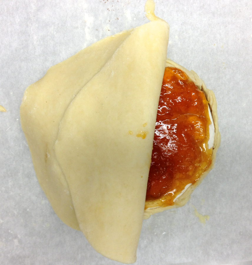 Spread apricot preserves over the cheese, then put another circle of pastry over top.