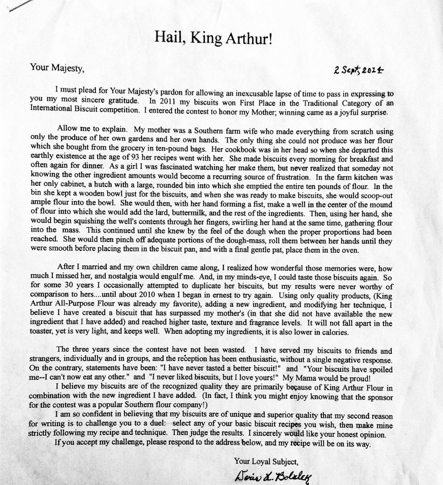 Doris quickly writes back, saying, "Thank you for responding to my biscuit challenge. I hoped my letter to King Arthur proposing a 'duel' would be received in the manner it was intended – one of fun, not of arrogance or conceit. Since your letter seems very warm and encouraging, I believe you have recognized my intent."