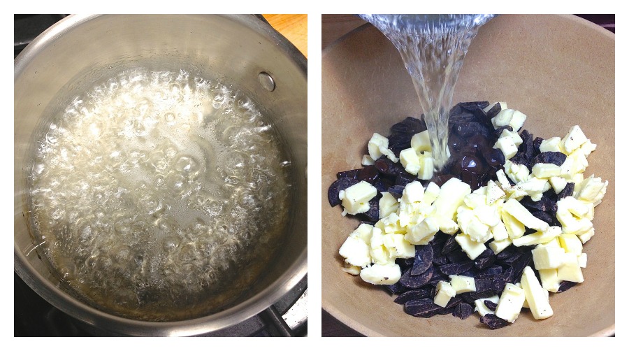 Chop the chocolate and dice the butter or margarine into 1/4" pieces, and place them in a mixing bowl. Pour the water into a saucepan, add the sugar and salt, and bring to a boil, stirring occasionally to be sure the sugar dissolves.