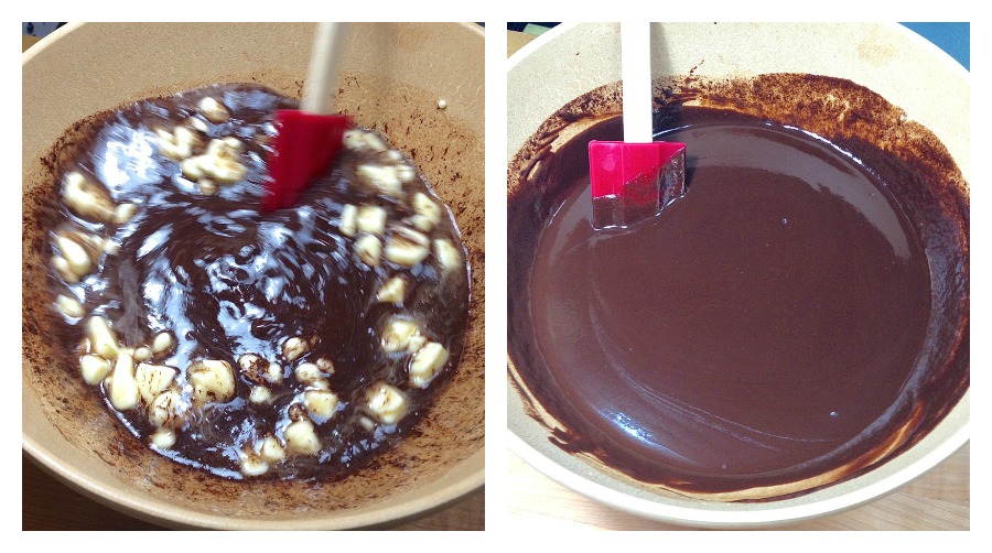 Remove the sugar water from the heat, and pour it over the chocolate and butter.