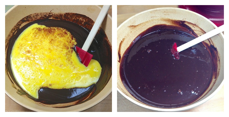 Add the eggs to the chocolate mixture once it's cool enough not to cook the eggs. Again, no beating required. This cake is meant to be moist and dense, so you don’t really want to introduce a lot of air bubbles.
