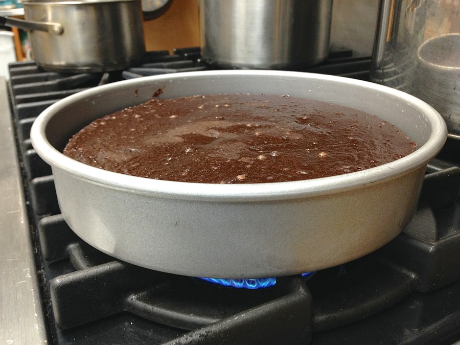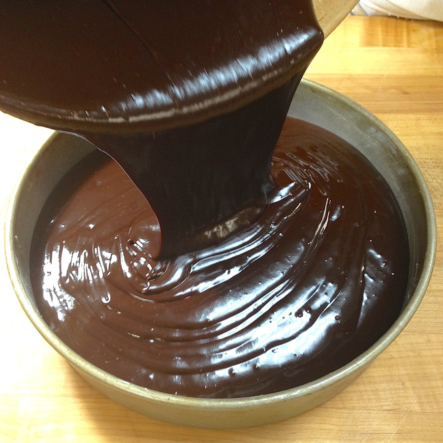 I must admit, however, that the Chocolate Truffle Cake and I got off to a rough start. I first met this cake while assisting in a baking class, assigned to bake all the students’ cakes. This involved placing several cakes in a giant, heavy pan, pouring boiling water around them, and then ever so carefully sliding the whole thing into the hearth oven, trying my best not to burn myself or splatter water onto any of the cakes.