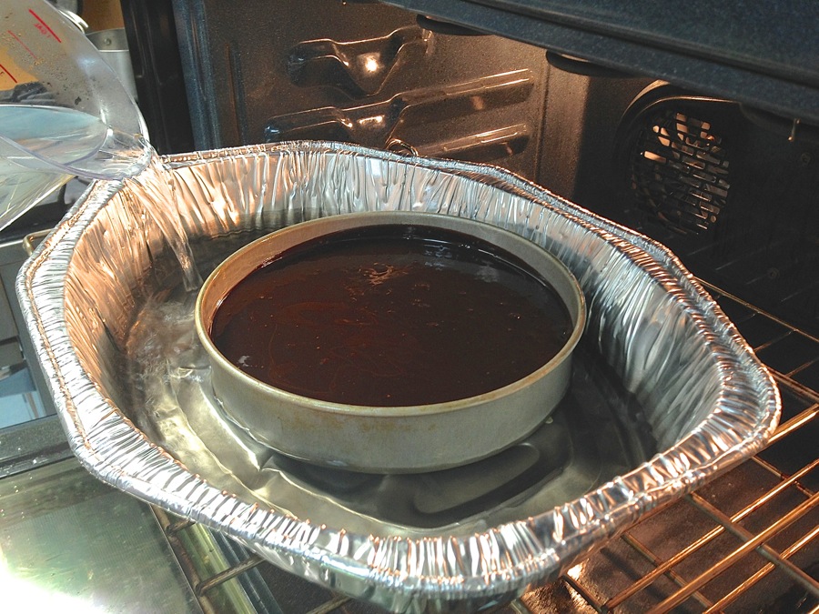 Place the cake in a large, deep baking pan that's already set on the oven rack. I use a disposable roasting pan. Slowly pour the boiling water into the deep pan, to bring it halfway up the side of the cake pan.