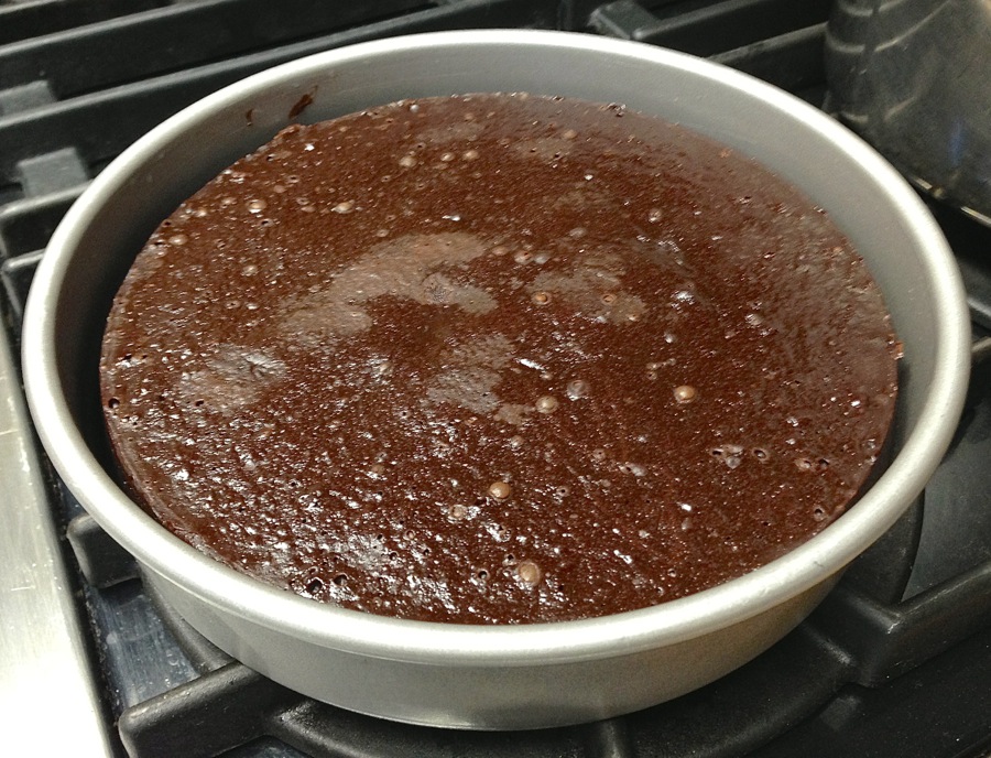 Bake the cake for 45 to 50 minutes, and remove it from the oven. The center should feel set when you touch it, and the edges will be just starting to pull away from the sides of the pan. The cake pictured above had been out of the oven for a bit, so it shows more pulling away from the sides than will be apparent when your cake first comes out of the oven.