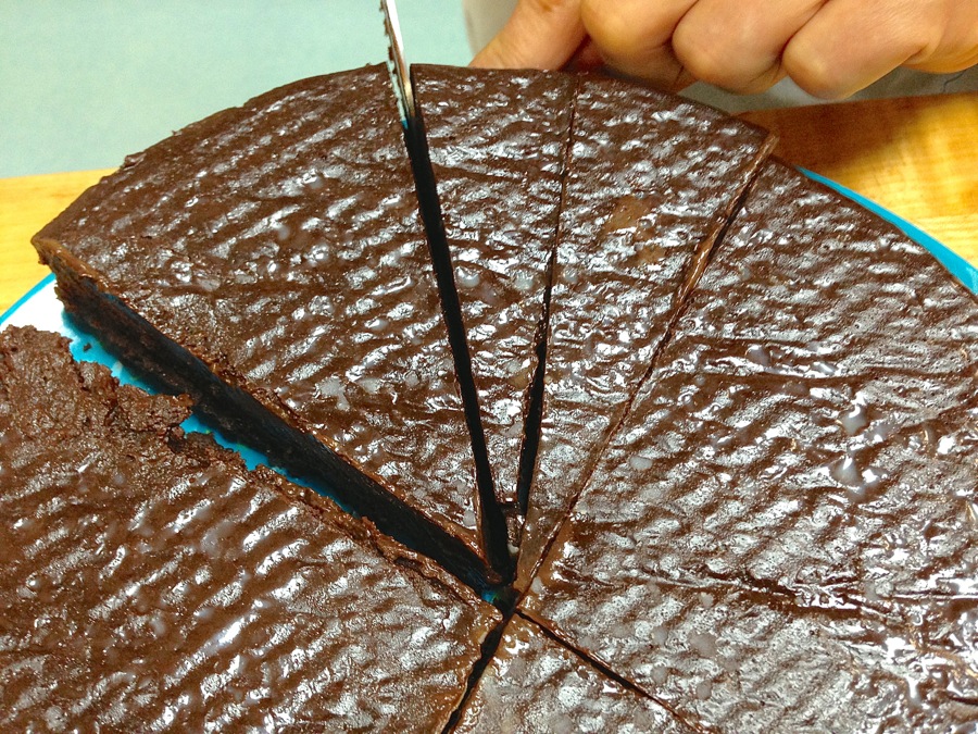 To finish and serve, cut the cake into at least 16 pieces – it's very rich. To prevent sticking, use a sharp knife, dipped in hot water and wiped off after each slice.