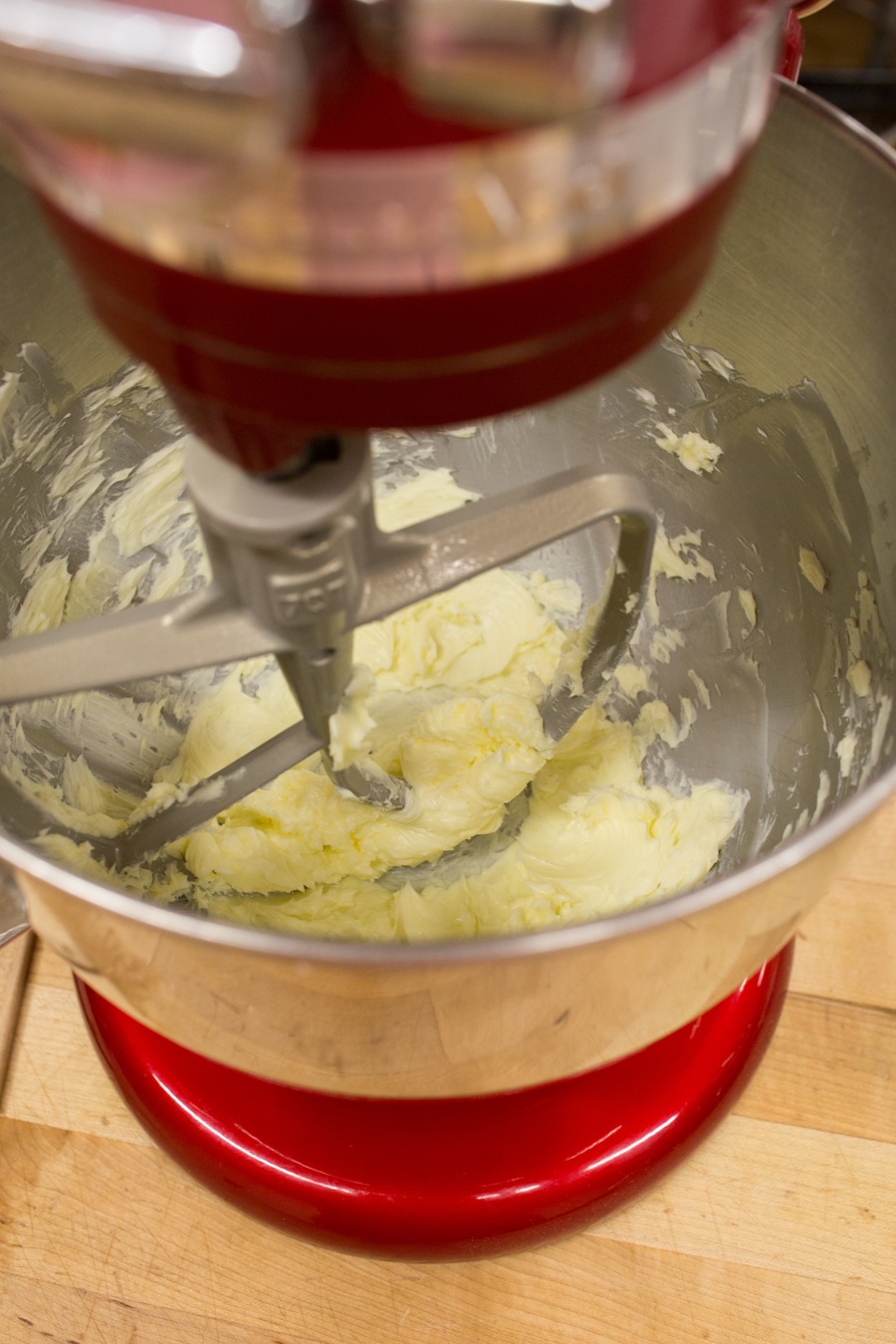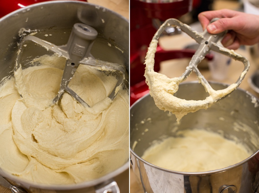 Gradually stream in the sugar, salt, and vanilla. Once all the ingredients are added, beat ("cream") on medium-high speed for 5 minutes. Notice how the mixture has lightened in color considerably.