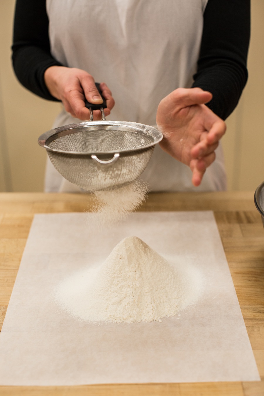 Sift your flour and baking powder together. I like to whisk the baking powder into the flour before sifting, to disperse it thoroughly. Sifting will get rid of any lumps and fluff up the flour slightly; do it onto a piece of parchment paper, so you can easily direct the flour into the mixing bowl when the time comes.