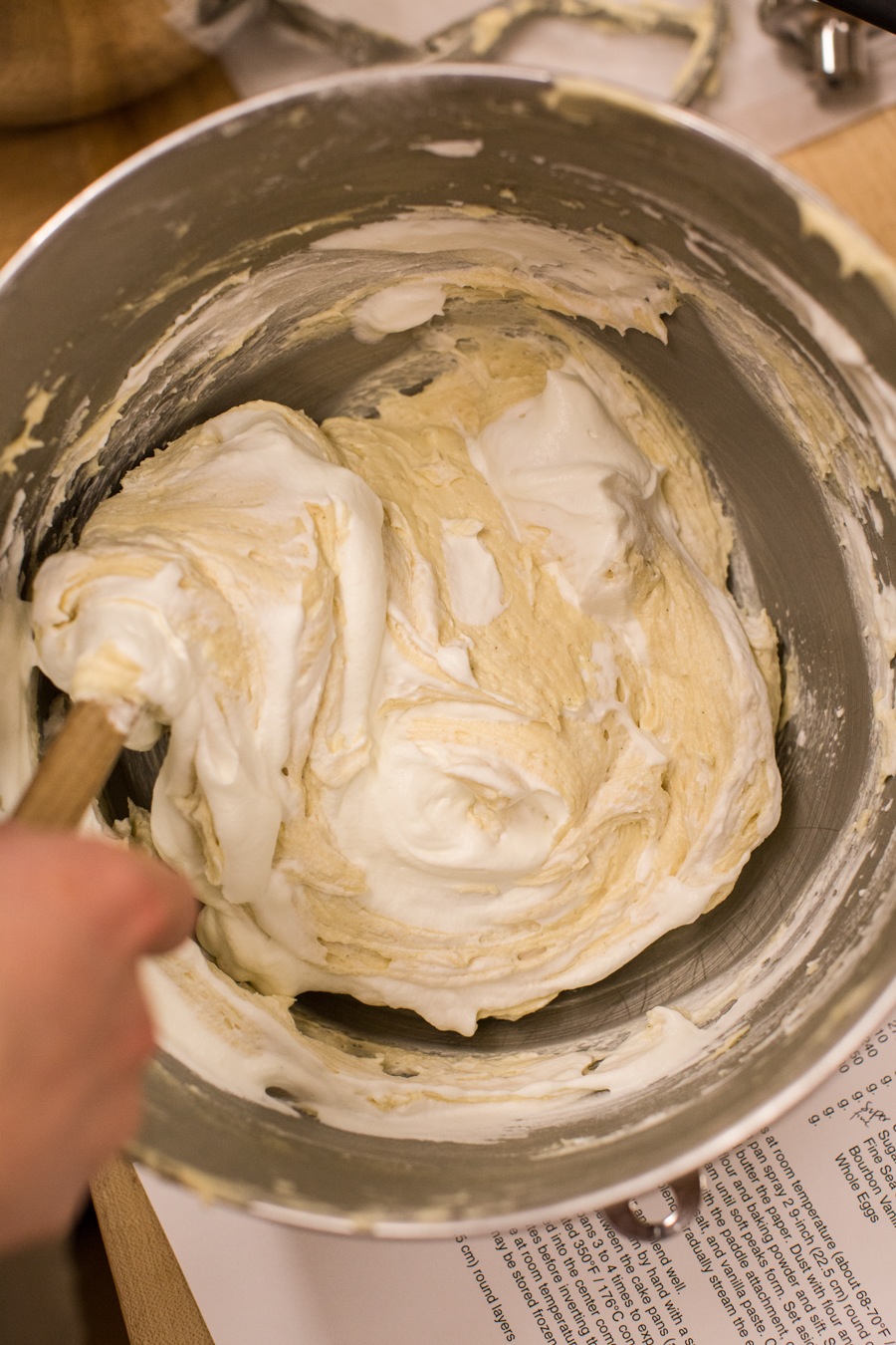 Next, blend in the remaining flour mixture at low speed. Scrape the bowl, and mix well. The batter will be creamy and smooth.