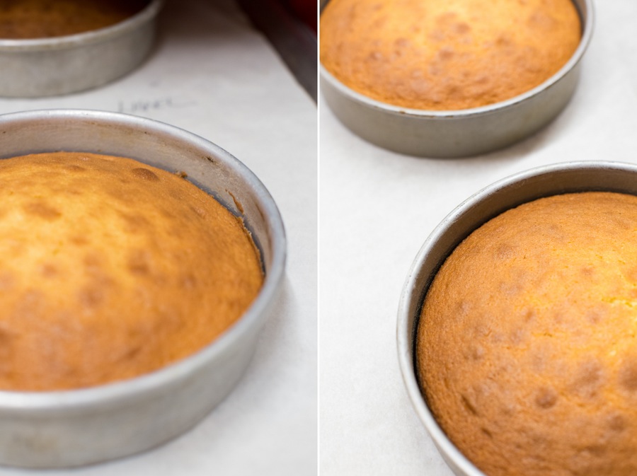You may also see the cakes have shrunk a little from the sides of the pans.