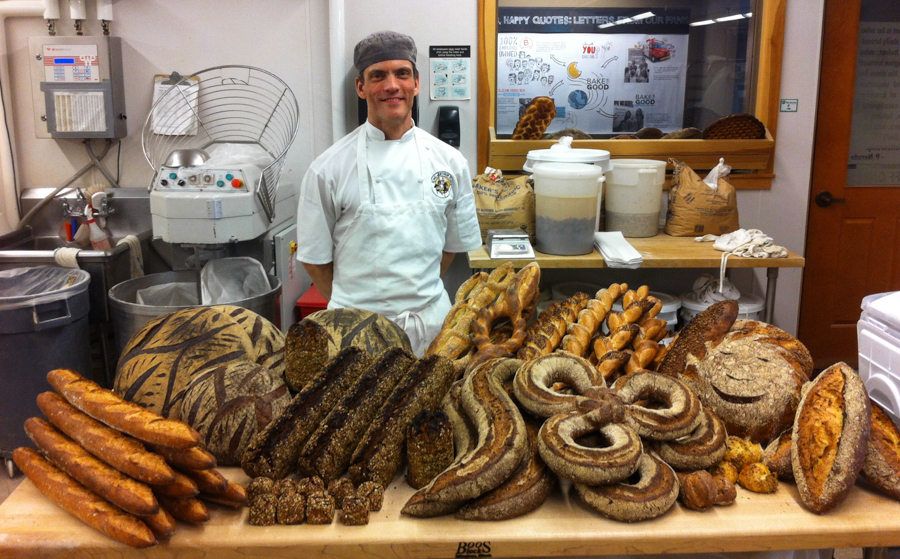 Martin poses with his final production run in the King Arthur Flour bakery. (photo by Jeffrey Hamelman)