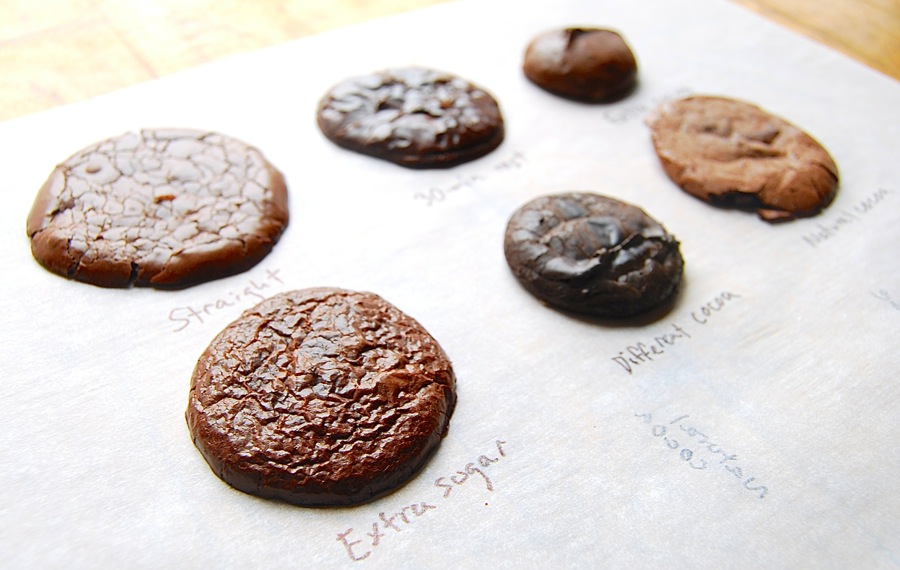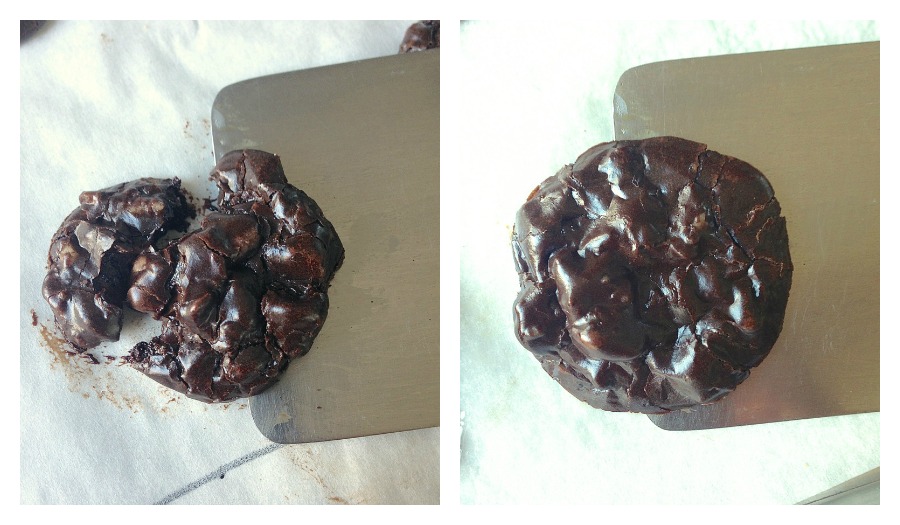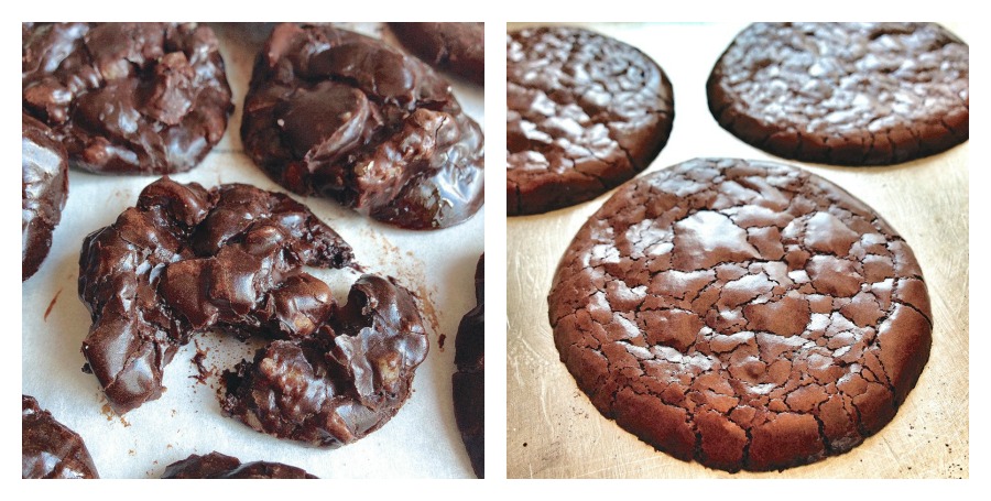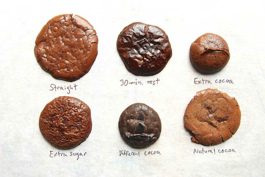 The "perfect" cookie will develop a shiny, crackly top surface, like the one pictured above. Too much sugar, too much cocoa, or not enough/too much baking will all tone down this effect. So if you achieve it – congratulations, you've baked the perfect Flourless Fudge Cookie!