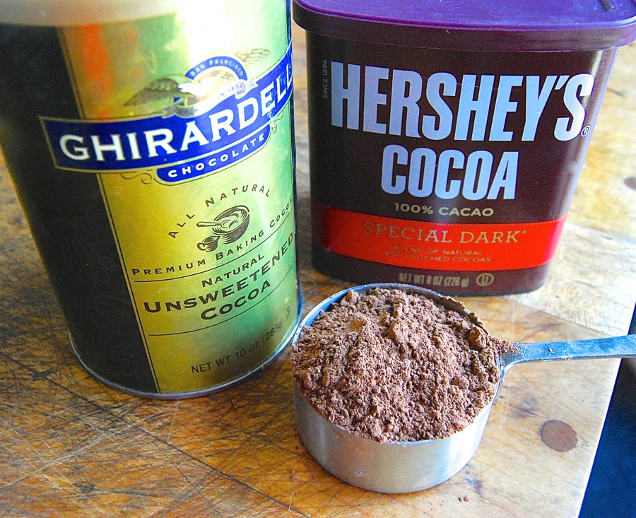 For testing purposes, I compared King Arthur's Triple Cocoa Blend (a combination of natural and Dutch-process cocoa) with Ghirardelli natural, and Hershey's Special Dark (again, a blend of natural and Dutch-process cocoas).