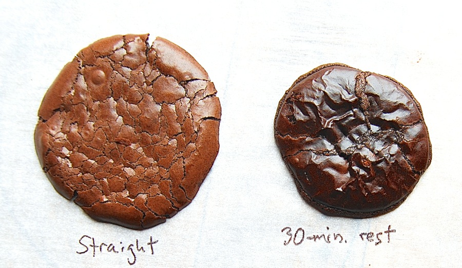 You'll notice the rested cookies also bake up darker. This is because the cocoa has had a chance to become fully hydrated – which is also partly why the cookies spread less. While both cookies taste the same, I prefer the look of the darker one.
