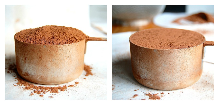 See the cup of cocoa on the left? It's pretty much a cup, right? Well, "pretty much" doesn't cut it in this finicky recipe. Spoon cocoa into your DRY measuring cup (please don't use a glass liquid measuring cup; it's not accurate enough for this use). Level off any excess off with a table knife. You should have 85g of cocoa.