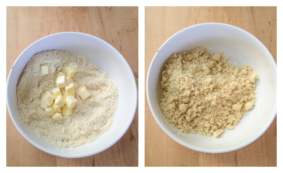 Add 6 tablespoons diced cold butter and work the mixture with your fingers or a pastry blender until it’s combined and crumbly.