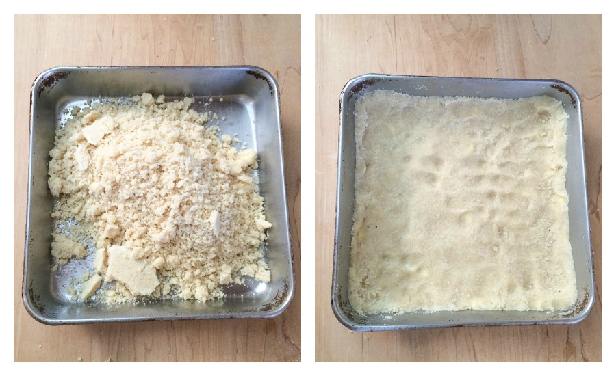 Dump the crumbly mixture into the prepared pan and shake it to distribute. Press the crust into the bottom and about 1/2" up the sides of the pan.