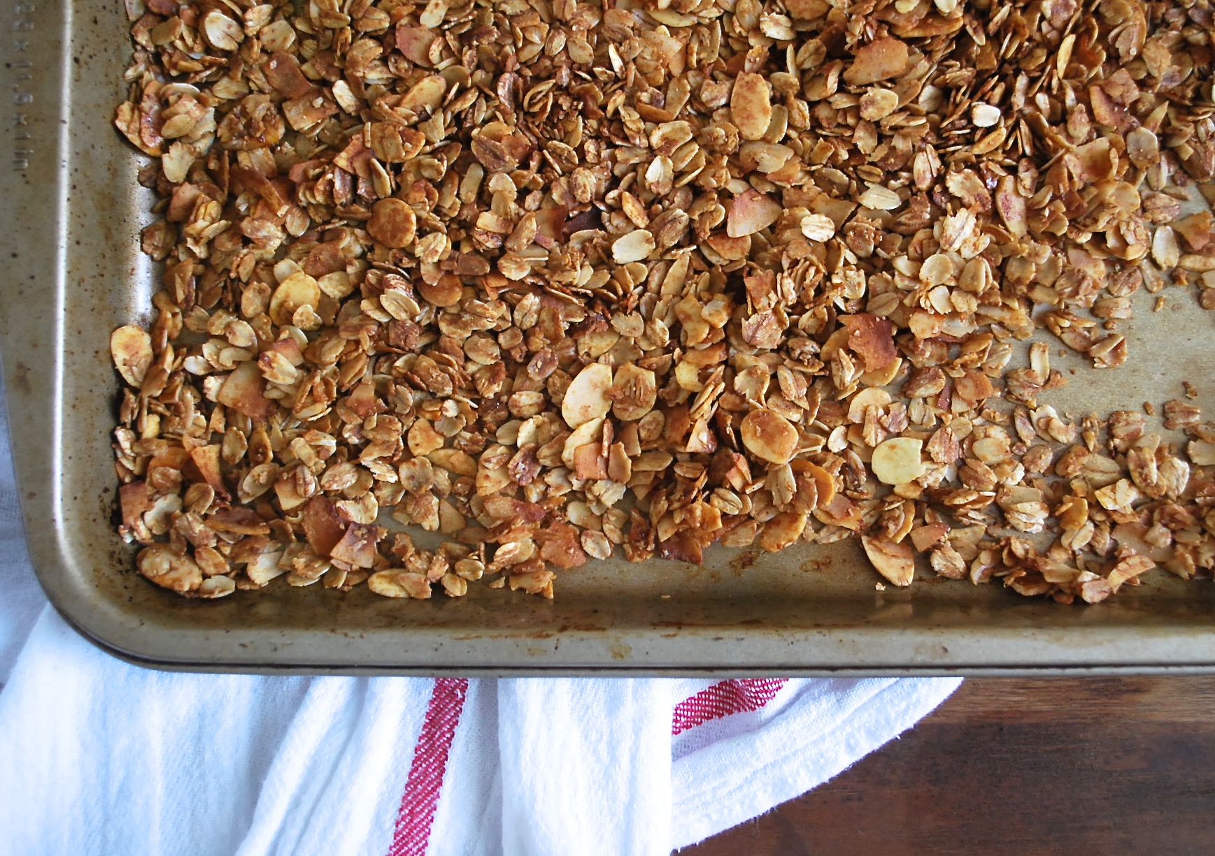 Then you need something to bind the granola together and make it nice and clumpy. Olive oil and melted coconut oil are my favorite choices here; use 1/2 cup of either one (or a mixture of both). If you like a crisper, clumpier granola, add more oil. If you like your granola really on the clumpy side (think granola clusters), try adding an egg white to your mixture. If you're looking for a healthier cereal, you can substitute applesauce (or even pumpkin) for the oil. Keep in mind that this is a loose rubric ā tweak it as you see fit.