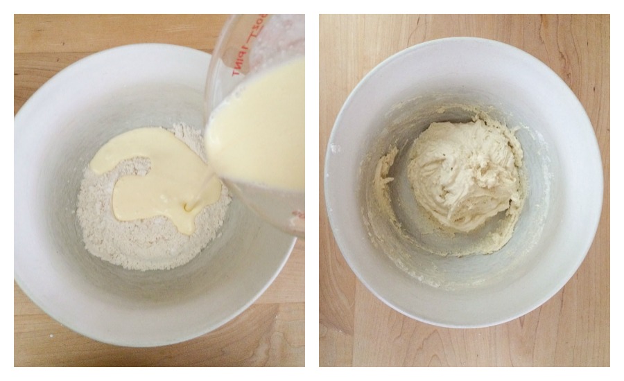 Pour the wet ingredients into the dry and stir together until combined.