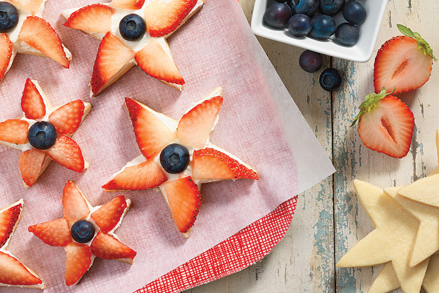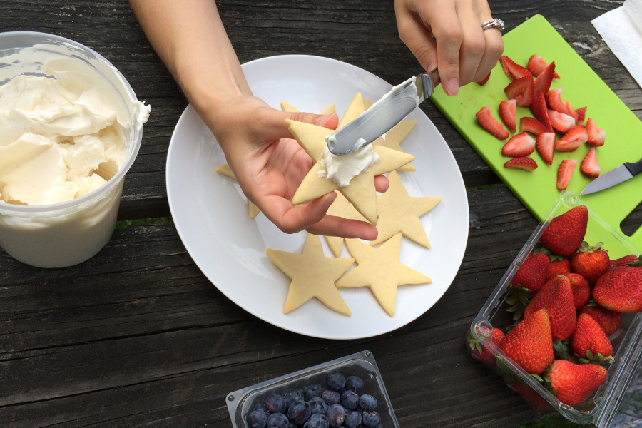 Arrange strawberry slices on the points of the star, trimming as needed. Finish with a blueberry in the center. Depending on how fancy you'd like to get, you may need to tidy up the frosting that crept over the edges while you were adding the fruit.