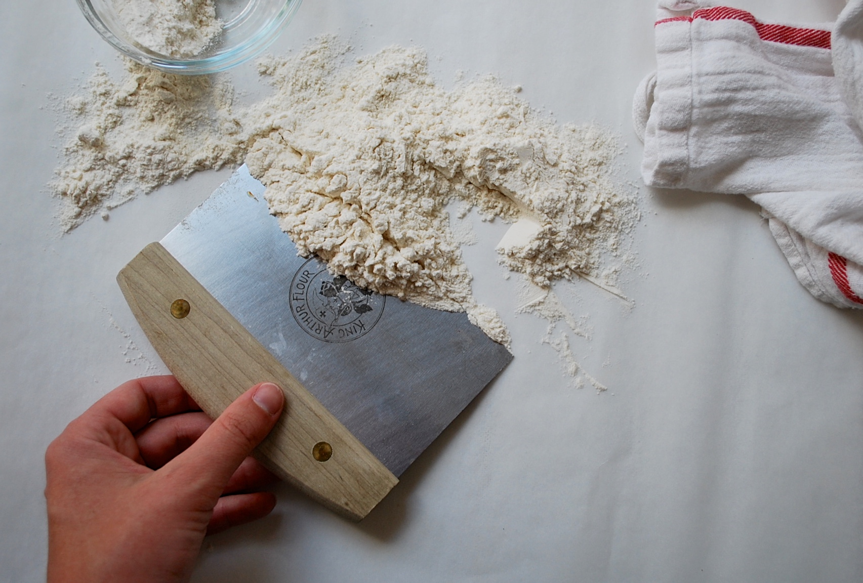 A bench knife is a useful kitchen tool for a baker in more ways than just cleanup. We use ours to divide bread dough and portion out rolls and loaves. It even helps to slice bar cookies and brownies neatly in the pan.