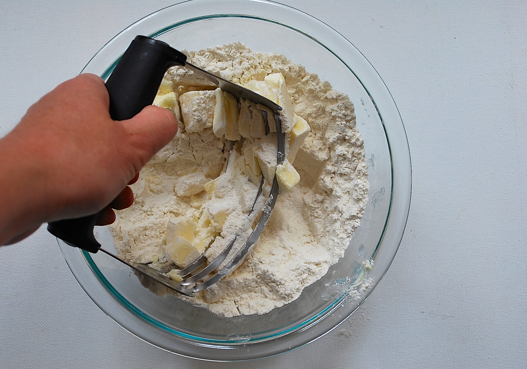 A pastry blender is small enough to store in a drawer and easy to clean. The blades quickly reduce chunks of cold butter into small flour-coated pieces. Those little pieces are the secret to making your pie crust and biscuits so flaky.