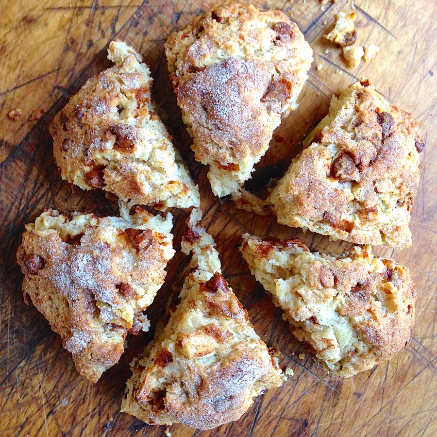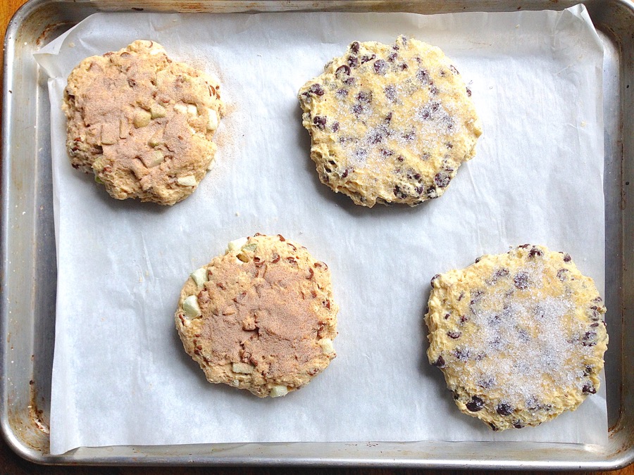 I'm making two types of scone here: Fresh Apple Cinnamon, sprinkled with cinnamon-sugar; and Chocolate Chip, topped with coarse white sparkling sugar.