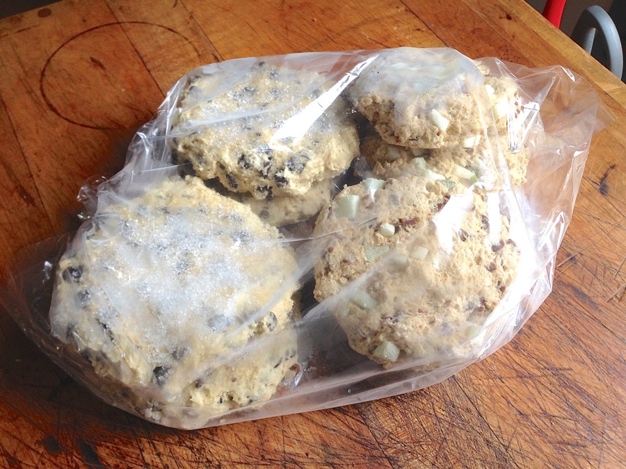 Let's go back to that unbaked scone dough. After you've shaped the dough into rounds and placed the rounds on a pan, put the pan in the freezer. Once the dough rounds are frozen solid, wrap them securely in plastic, and store them in the freezer for up to a couple of months.