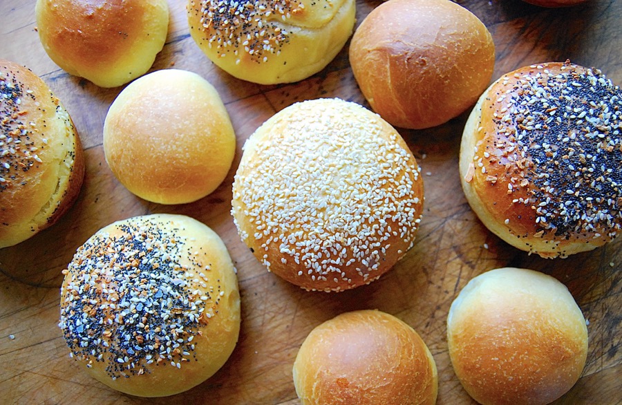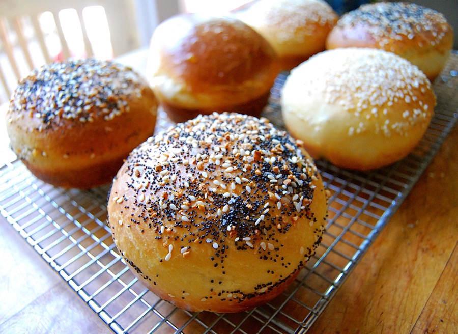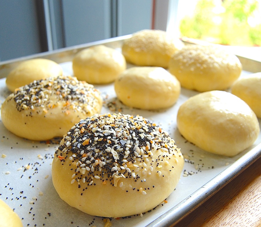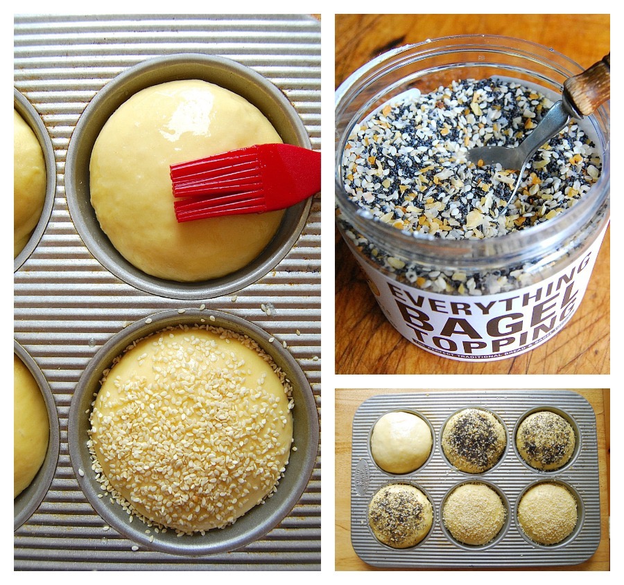 Then top with seeds: sesame, for a typical fast food-type sesame seed bun; or my favorite, everything bagel topping, a tasty mixture of poppy and sesame seeds, dried onion, garlic, and salt.