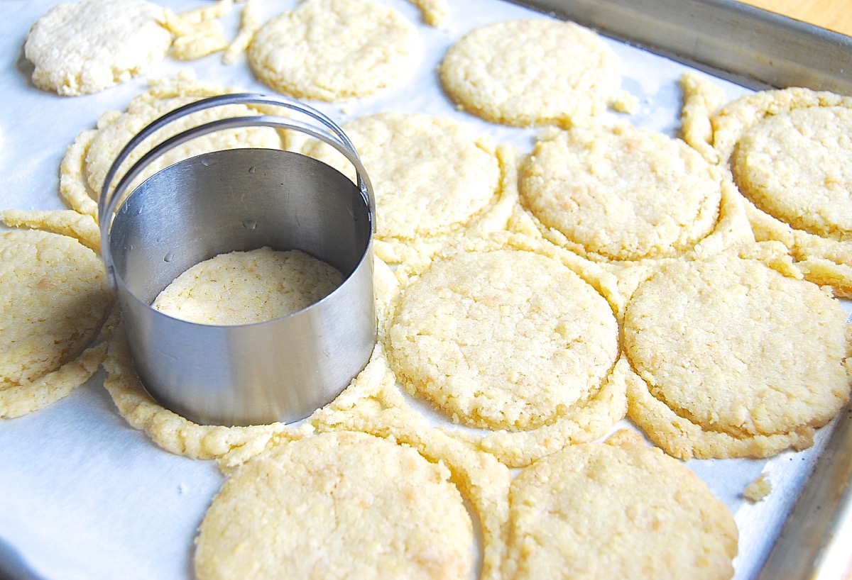 I positioned the cookies too close together on the cookie sheet; as always, I was in a hurry. So when the big blobby cookies came out of the oven, having all run together, I used a large (2 3/4") biscuit cutter to trim off the misshapen edges.