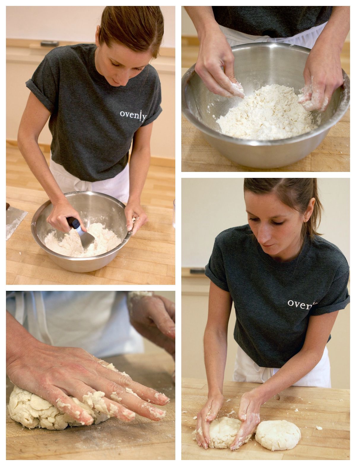 Press the dough together to loosely combine any ragged pieces of dough. Turn the dough out onto a floured work surface, and using the heel of your hand, press it together, using an outward rubbing motion to incorporate the butter fully. Halve the dough, and form each half into a ball.