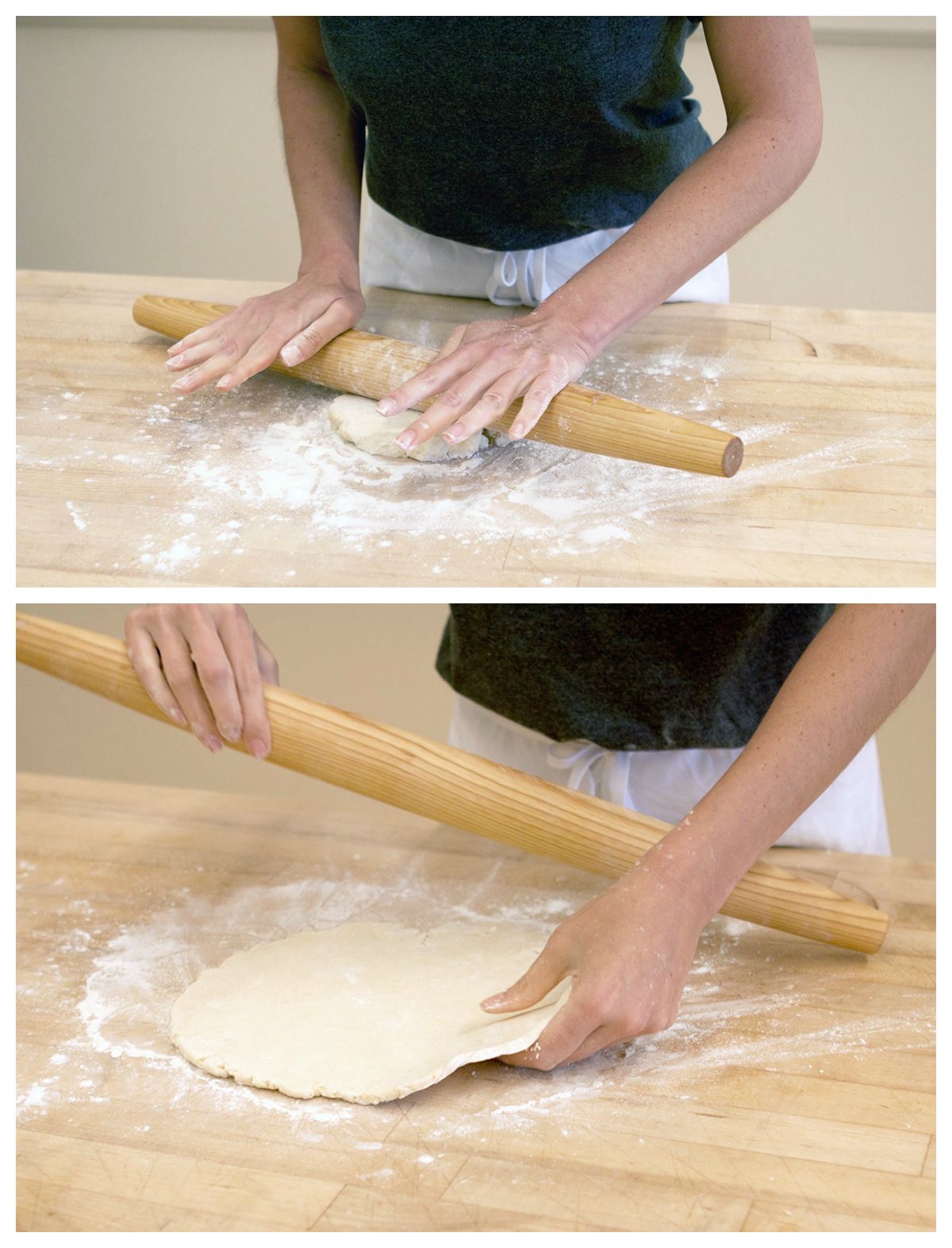Press and shape each half into a 6" disk about 1" thick. Cover with plastic wrap and refrigerate for at least 1 hour, or up to overnight. Refrigerating helps the dough's gluten relax, and makes the dough more elastic, so that it rolls nicely without breaking.