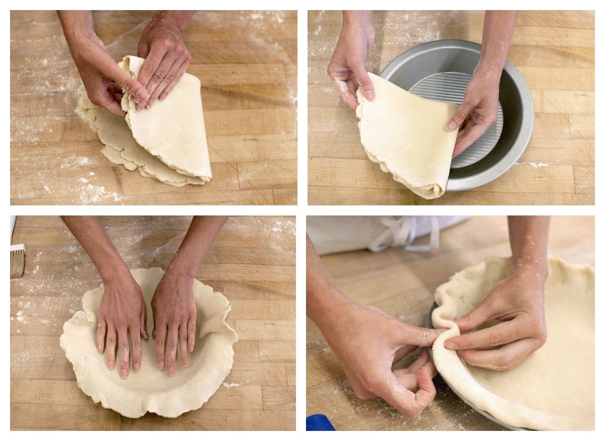 Fold the dough in quarters and gently transfer it to a 9" pie pan, brushing off any excess flour from the bottom. Press the dough against the sides of the pan. Tuck the overhanging dough under itself, crimping as desired. Cover with plastic wrap and refrigerate for about 30 minutes (or freeze for 10 minutes) before filling.