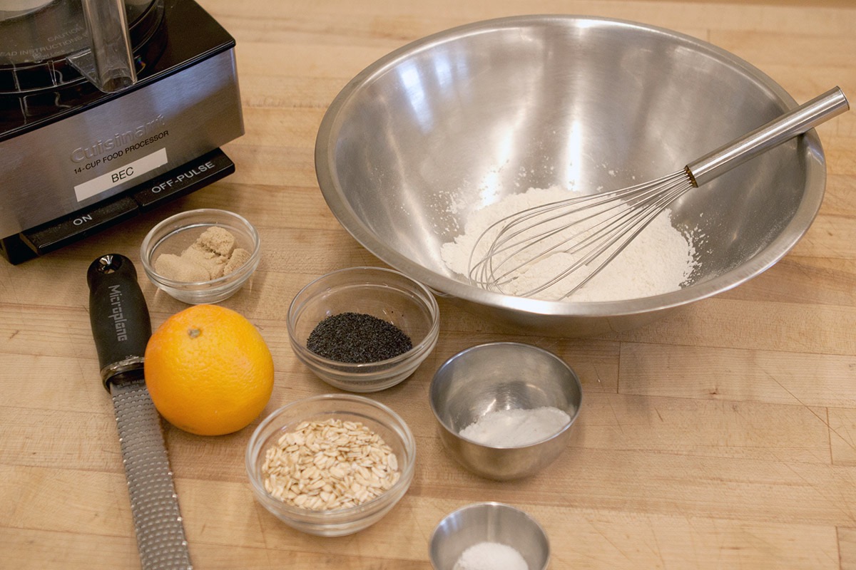 In a food processor, combine the vanilla sugar with the flour, oats, poppy seeds, and salt. Add the butter, and grated orange peel (if desired); pulse until a loose dough forms.