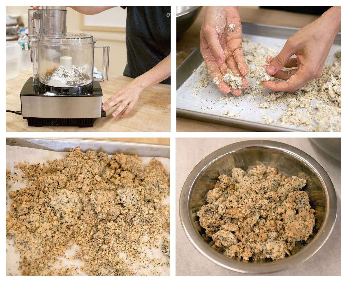 Scrape the dough onto a parchment-lined baking sheet, forming small and large clumps of dough with your hands. Bake the crumble topping until cooked through but not browned, about 15 minutes. Transfer it to a rack to cool completely.