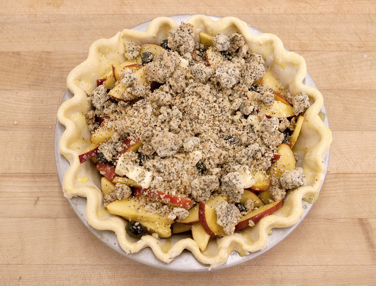 Once the crust is thoroughly chilled and the topping cooled, fill the crust with the fruit mixture. Sprinkle evenly with the crumble topping. Place the pie on the prepared baking sheet.