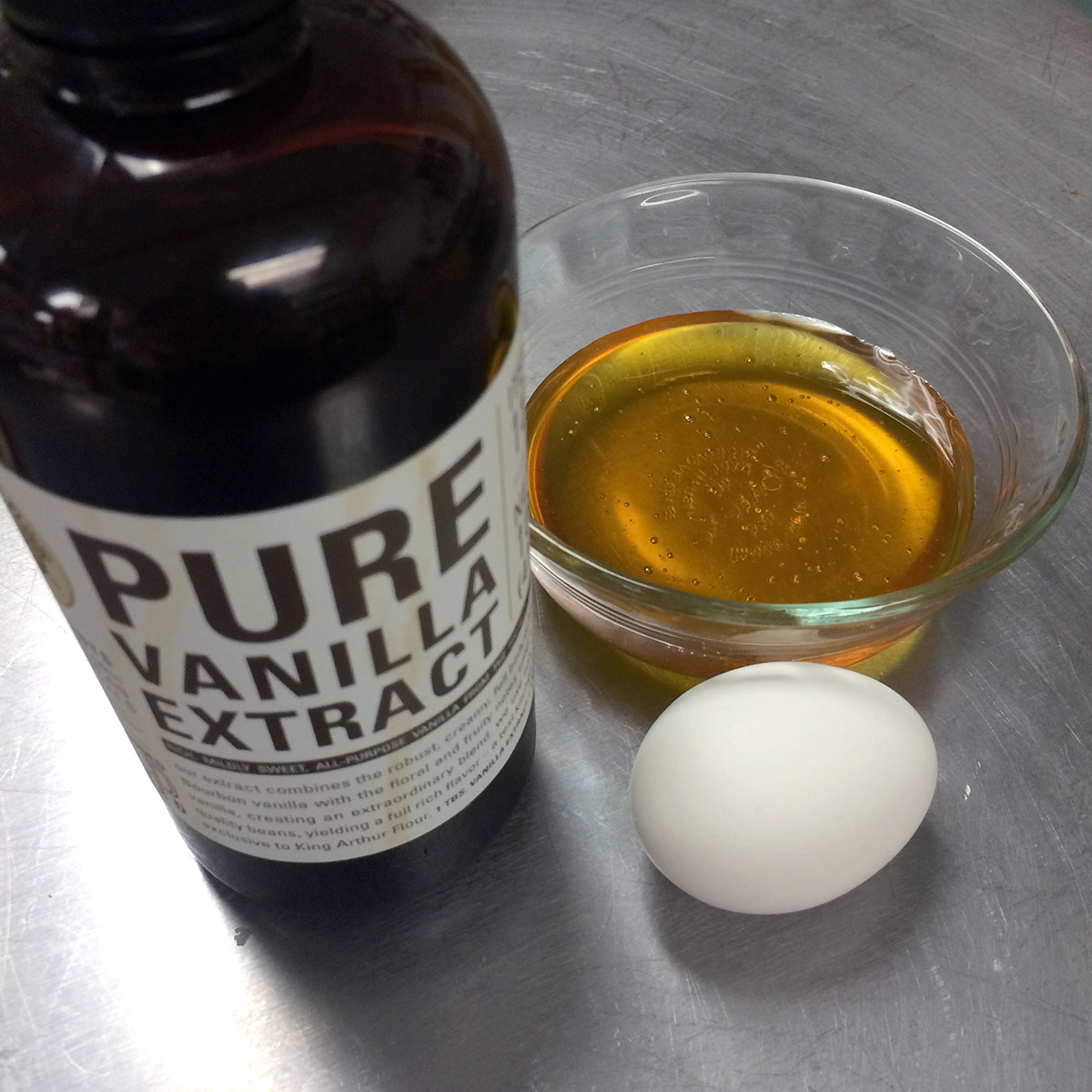 Mix together 1 large egg, 1/2 cup honey, and 1 teaspoon vanilla.