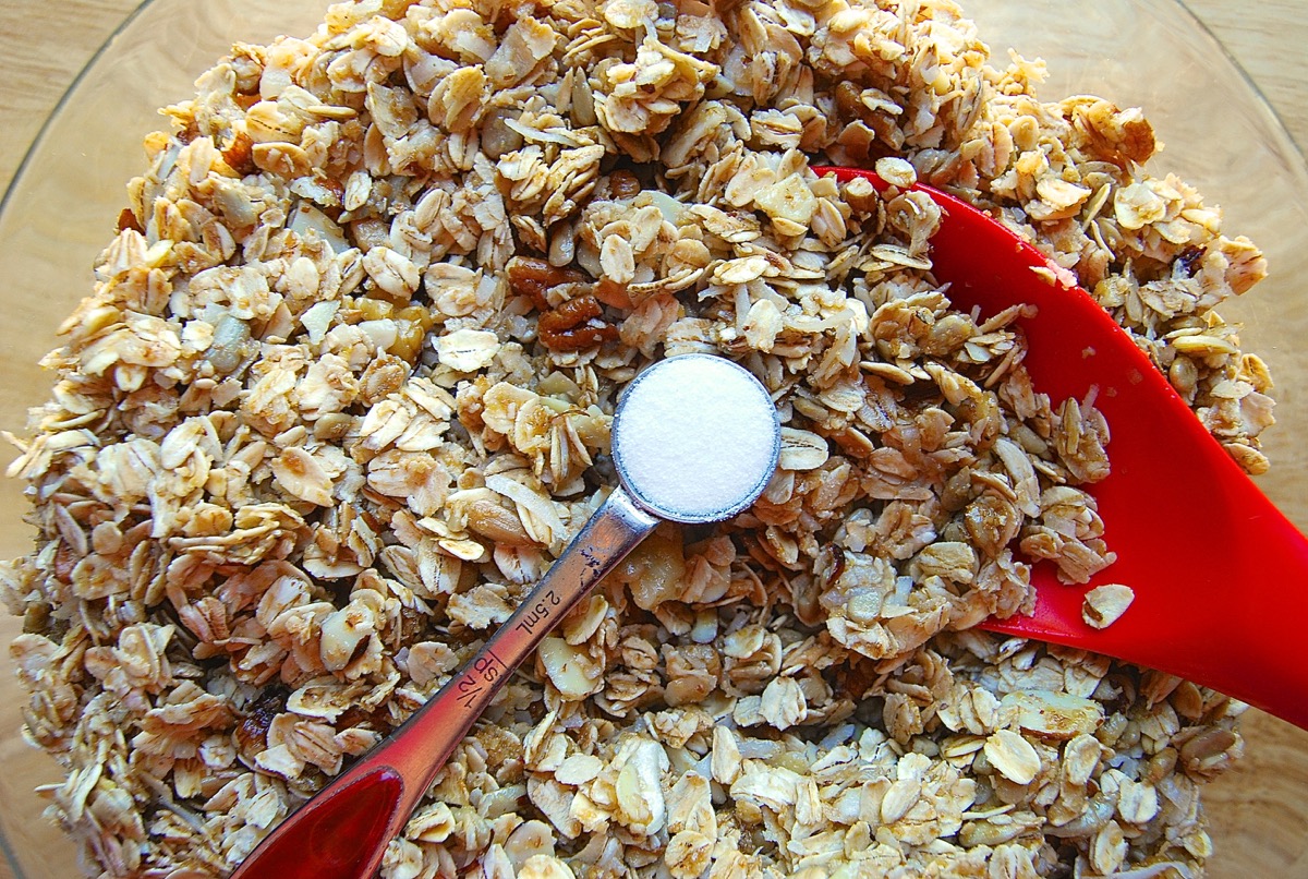 If you stir salt into granola with the oats, seeds, nuts, and other dry ingredients, it'll sift through everything and collect in the bottom of the bowl. Instead, mix salt with the oil, liquid sweetener, and any other liquid ingredients. That way, it'll be evenly distributed throughout the mixture.