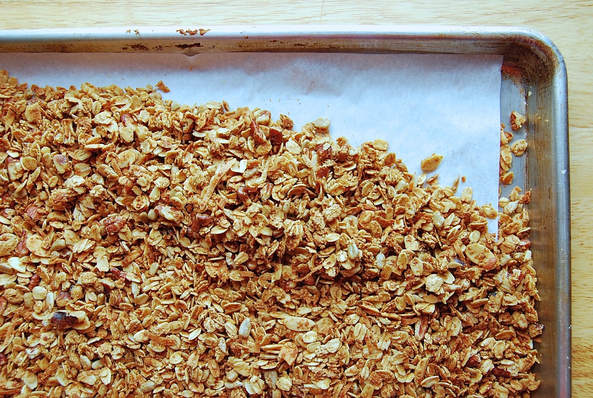 While granola certainly isn't as sticky as brownies or cake, it does have a tendency to become hard and crusty as it bakes – which, after all, is the goal. To prevent having to scrub a crusty pan, line the pan with parchment before spreading it with granola.