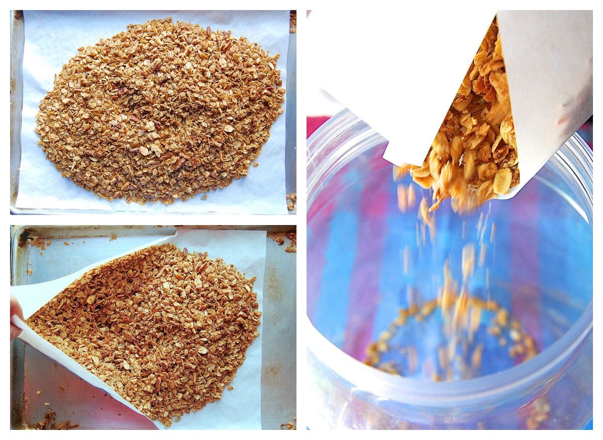 Lift the edges and ends of the parchment to slide the baked granola into the center. Grasp the parchment at both ends, and pick it up. Narrow one end into a "funnel," and pour granola into its storage container.