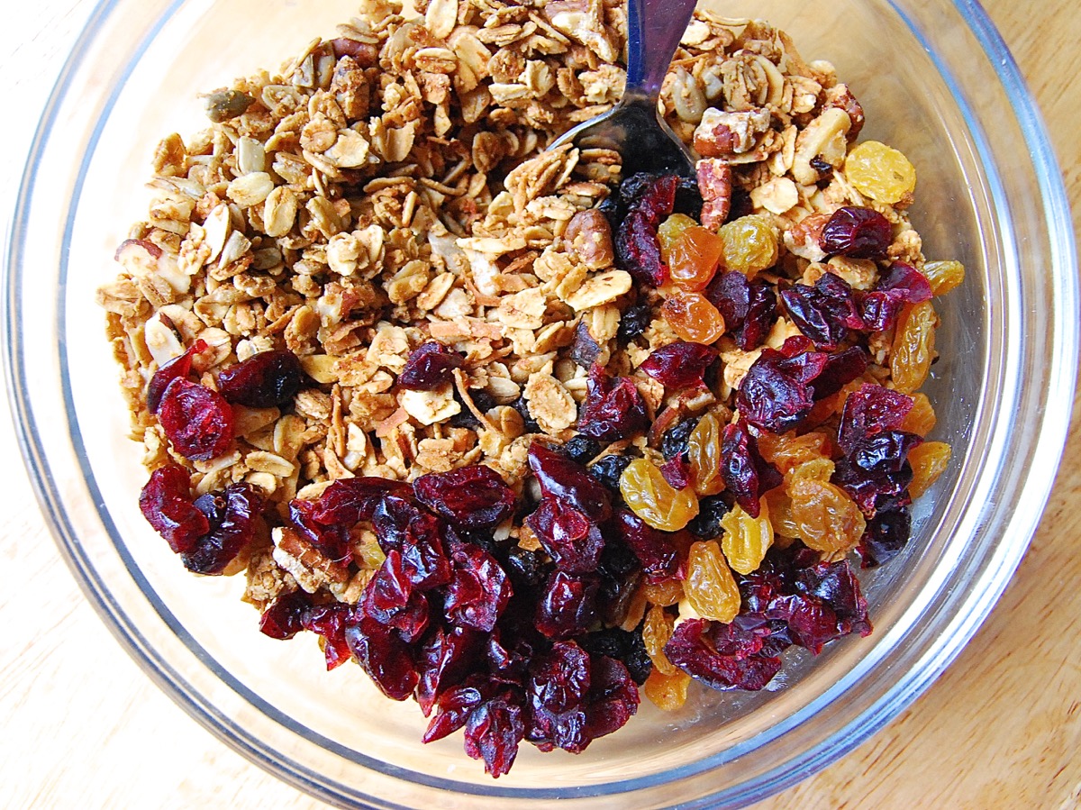 Unless you plan on eating all of the granola fairly quickly (or giving it away as gifts), stir in a scoop of dried fruit weekly, rather than immediately after baking.