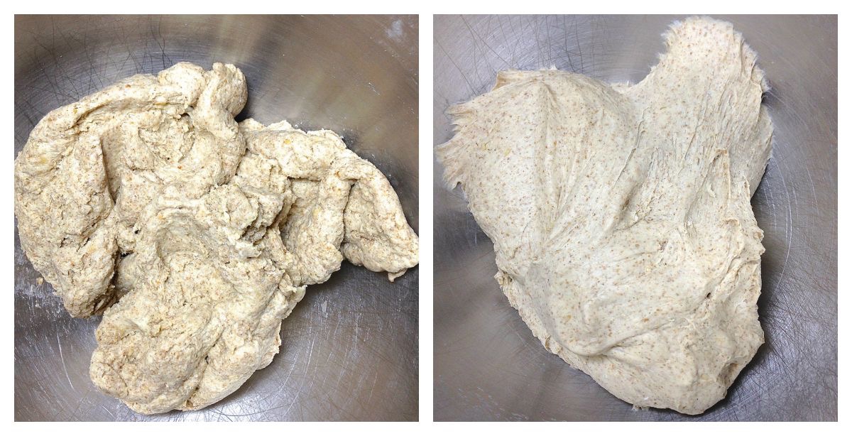 If you've never made rye bread before, you'll be surprised by the dough's consistency, especially if you're making a loaf that's at least 50% rye flour. The dough is more clay-like than elastic (left, above); this is fine. Don't try to "knead it into shape." It will never become as "supple" as a typical wheat-based dough. Even when fully kneaded (right, above), it probably won't form a smooth ball; you'll need to shape it into a ball prior to its first rise.