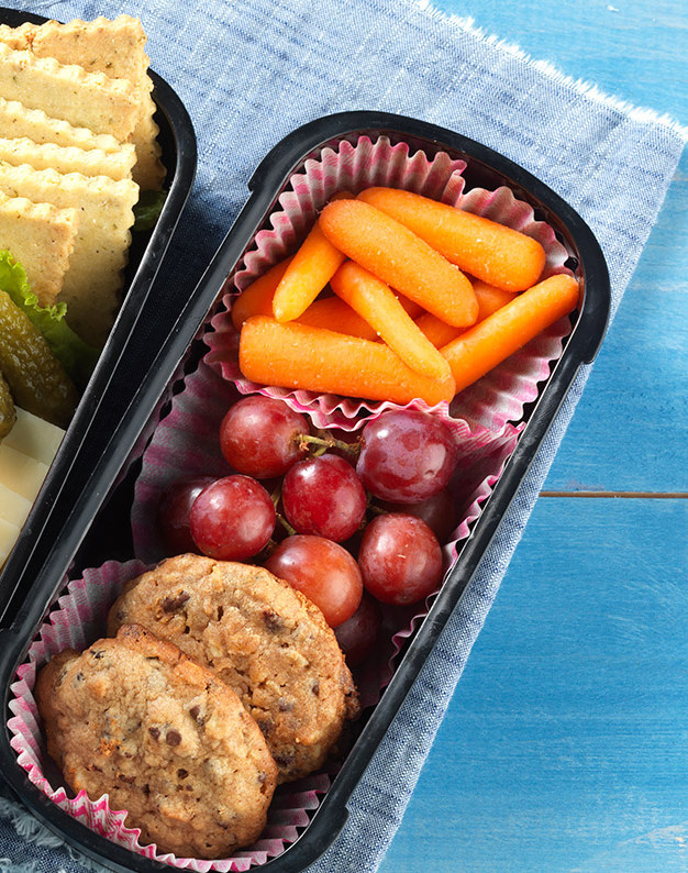 Notice the colorful ruffled papers? To help control portion sizes, you can use cupcake/muffin liners, silicone cups, or even tasty greens as a wrapper. I've found that paper liners also help control moisture, so that your freshly washed grapes don't turn your cookies soggy.