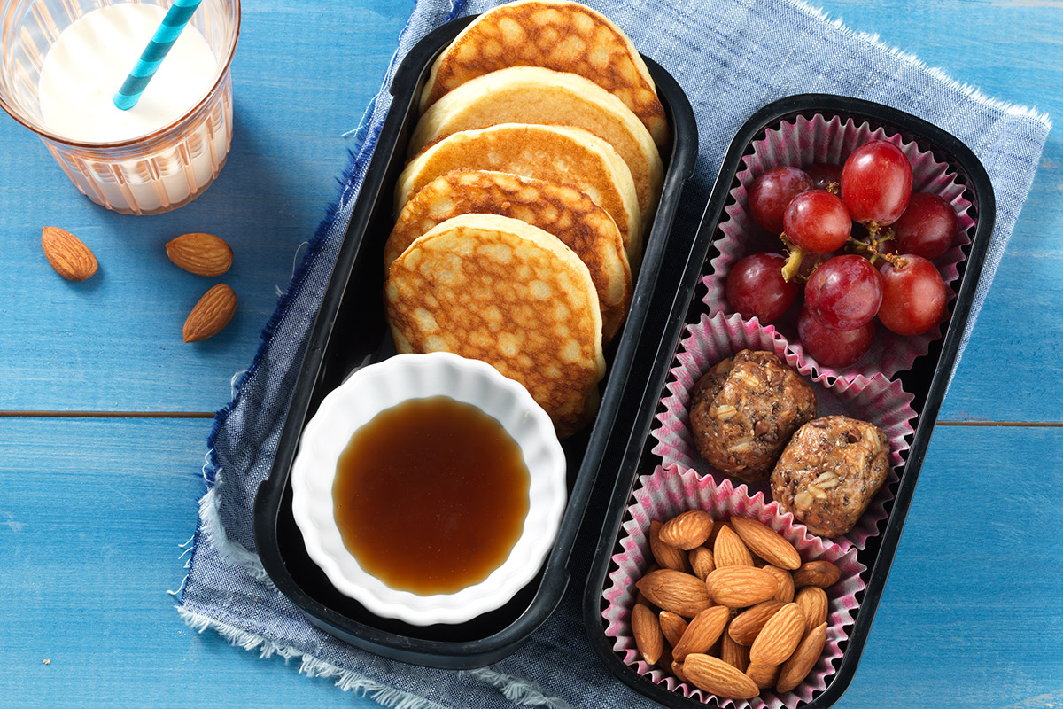 The boxed lunch above happens to be gluten free as well as pleasing to the eye and taste buds. A few silver dollar-sized pancakes, some fresh Vermont maple syrup, and healthy whole almonds give you sweetness and crunch. Our No Bake Energy Bites provide protein and whole grains; add some sweet red grapes for a refreshing finish.