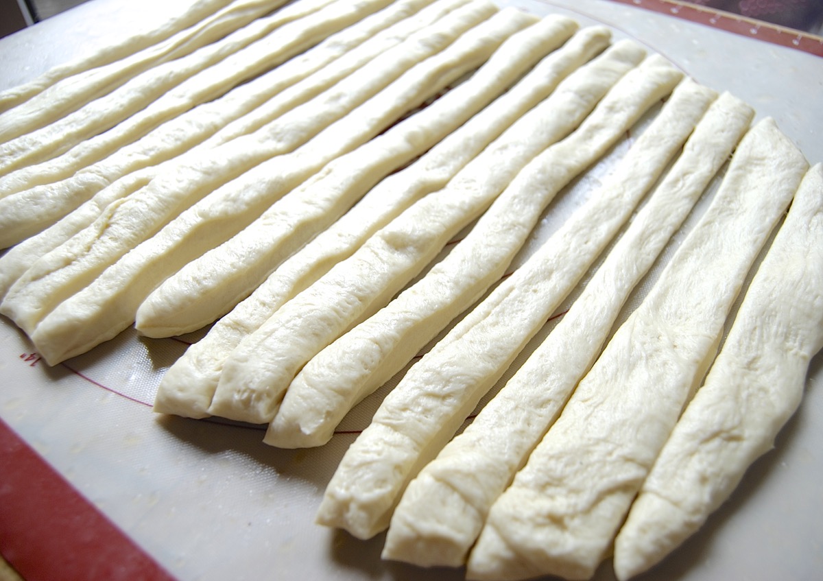 Or you can do what I've done here: pat/roll the dough into a rectangle and cut it into however many knots you're planning to make. I've cut this batch of dough into 16 pieces.