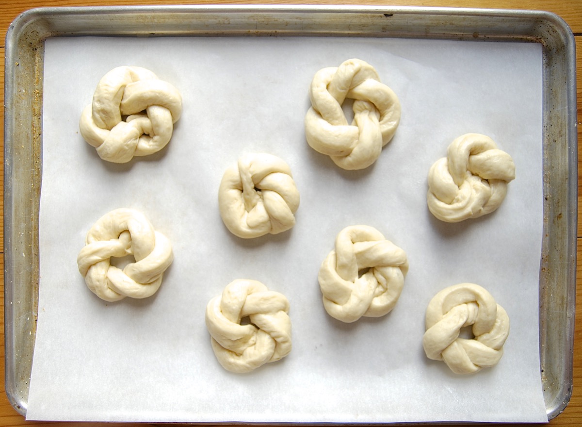 Let the knots rise for about 30 minutes or so; you don't want them to become really puffy, as the more they rise and the puffier they get, the closer they come to untying themselves once they hit the oven.