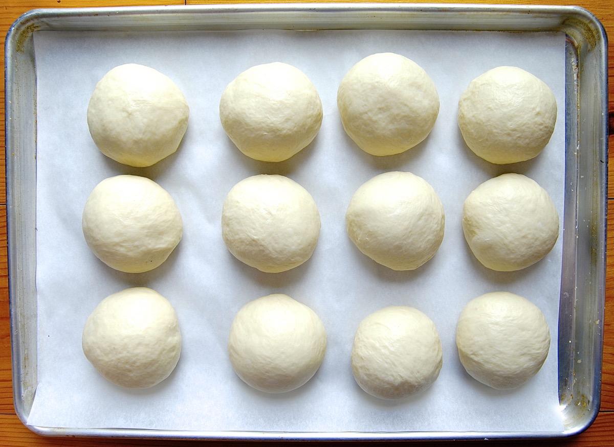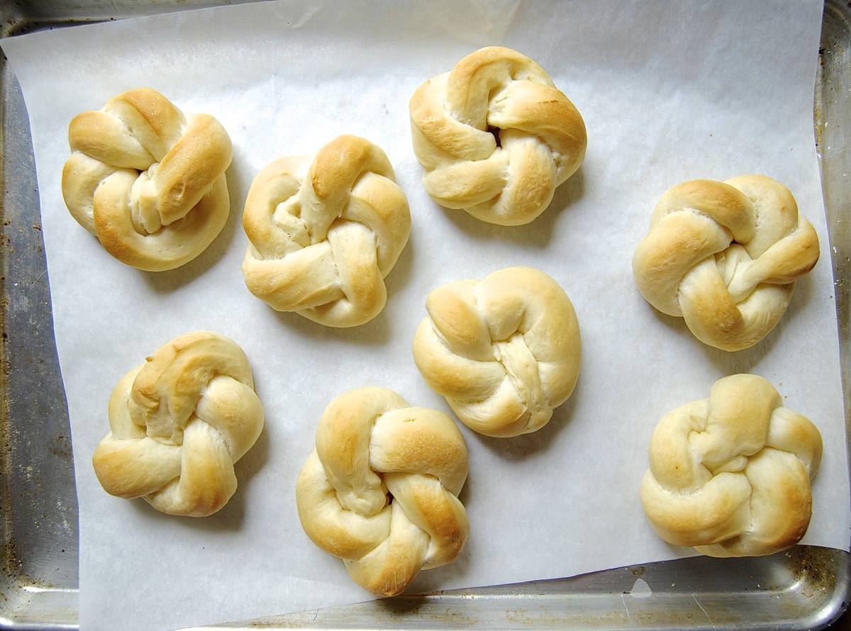 Bake the knots in a 350°F oven for about 15 minutes. I like to let them remain light-colored, rather than becoming dark golden brown. That's because, rather than making knots with leftover pizza dough, I use a softer, dinner-roll type dough, one with milk and oil and potato.
