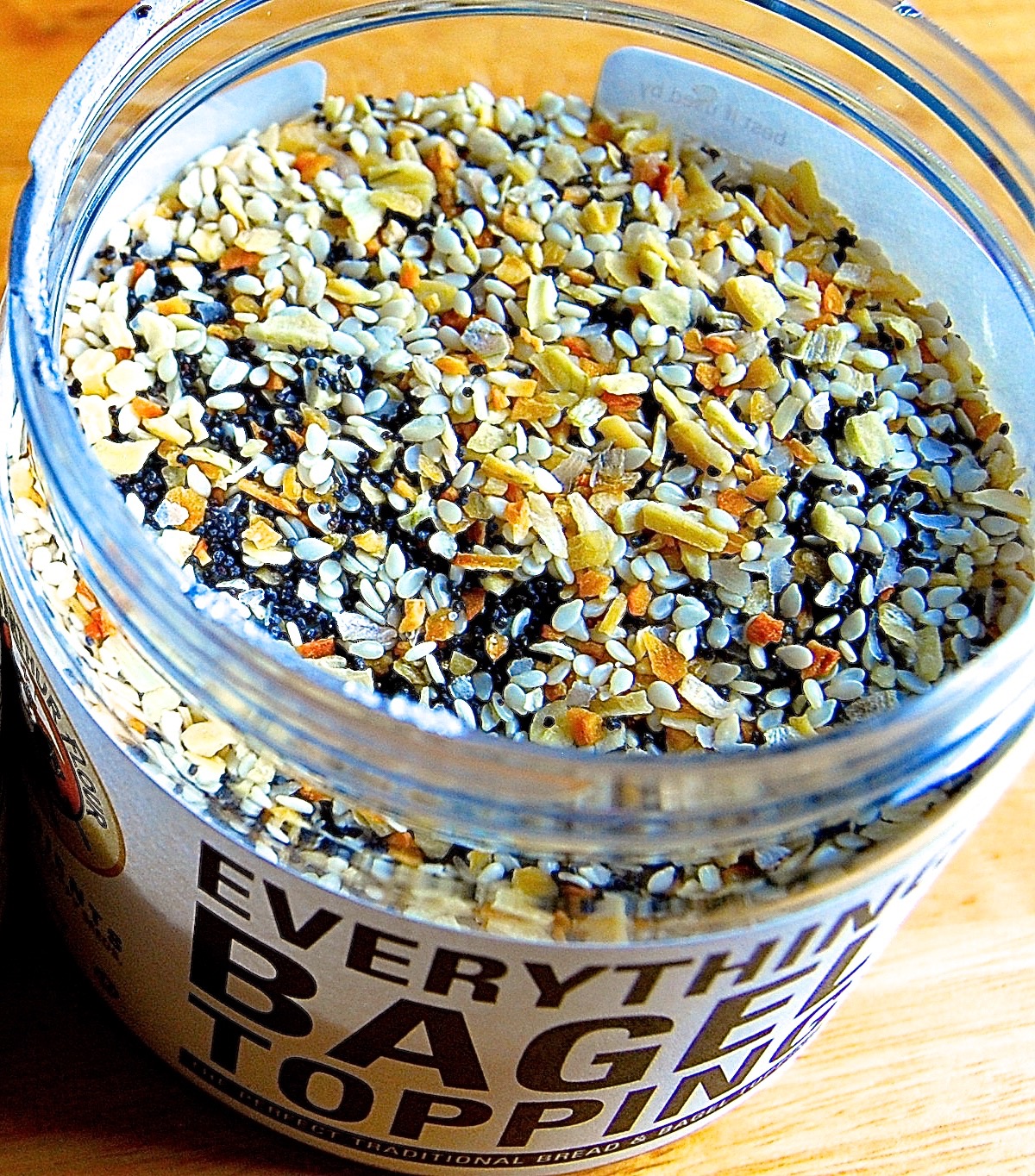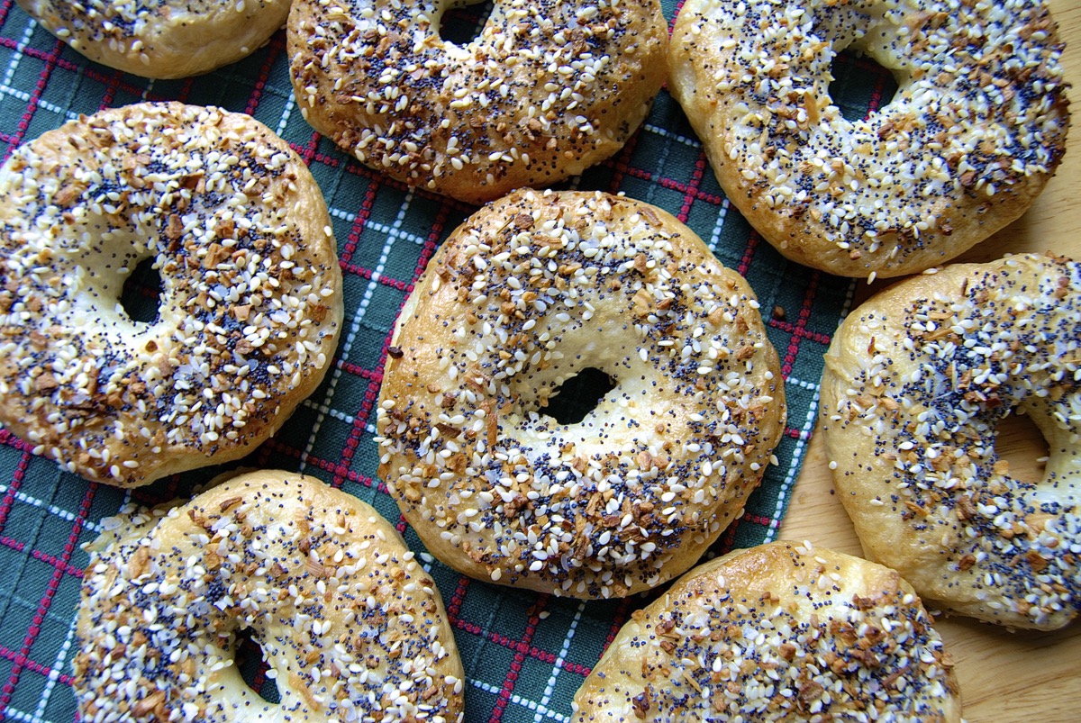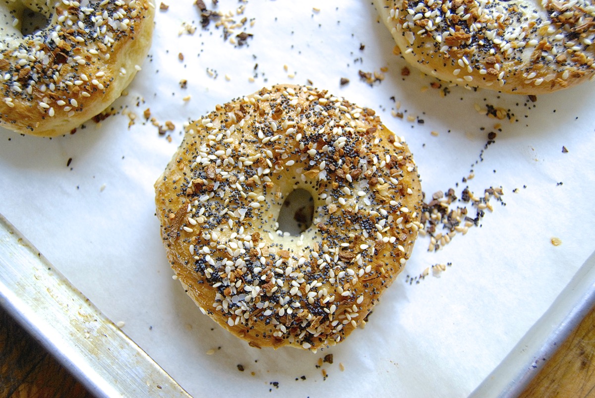 You can use any bagel recipe; I'm using our basic bagel recipe. For everything bagels, though, your key ingredient is "everything": everything bagel topping, a crunchy, tasty mixture of poppy and sesame seeds, toasted onion, garlic, and salt.