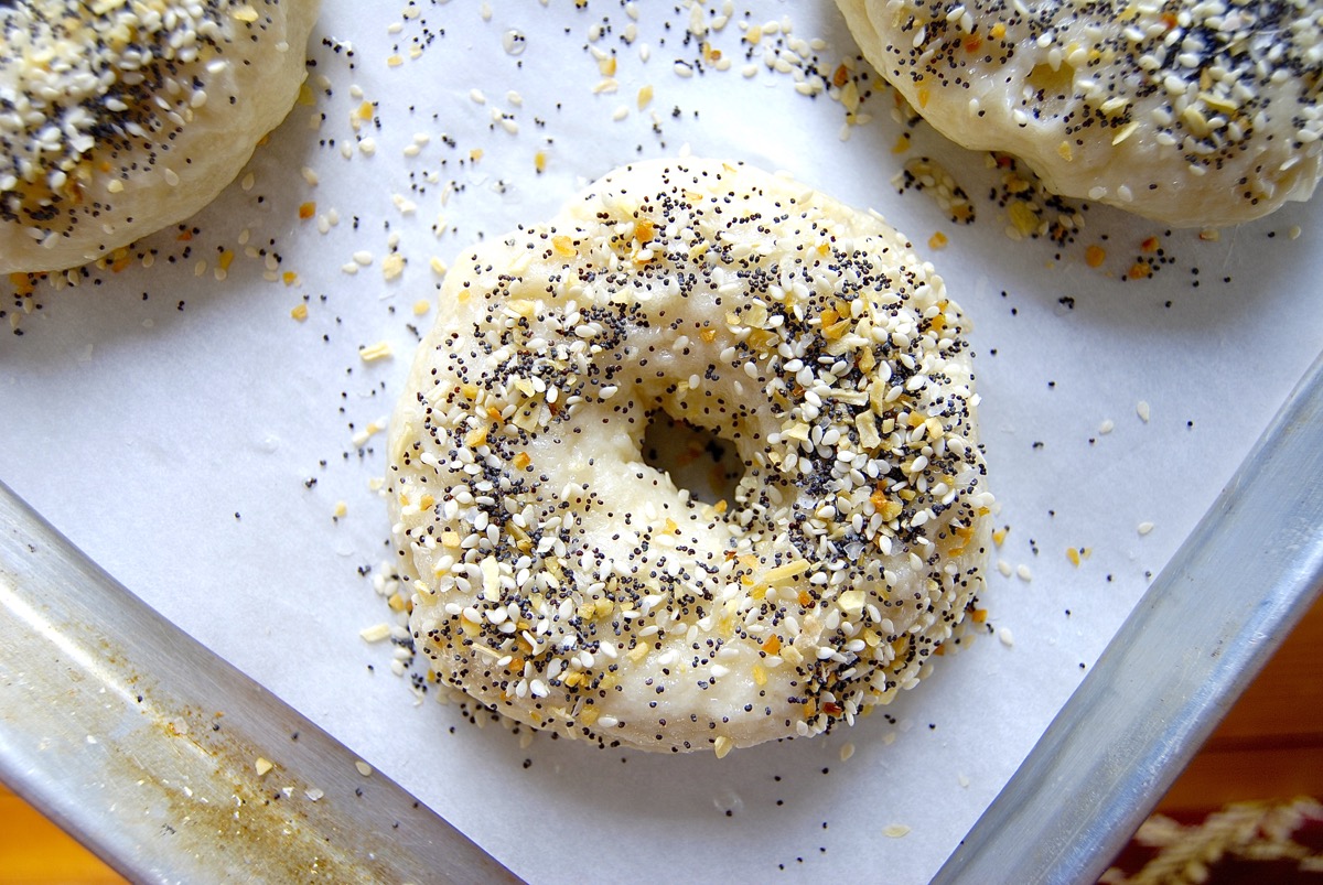 Once you've simmered your bagels and returned them to the baking sheet, brush them with an egg white mixed with 1 tablespoon water; then sprinkle heavily with the everything topping.