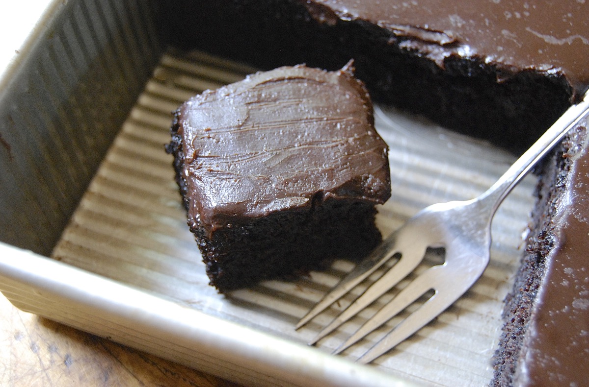 Born during World War II, with food rationing in effect, Cake Pan Cake uses neither eggs nor milk nor butter. Yet darned if it isn't the moistest, richest, deepest/darkest chocolate cake you'll ever taste.