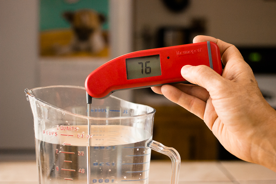 Use a digital thermometer to test the water temperature and aim for starting the mix with cooler water on a hot day and warmer water on a cool day. But keep in mind that we’re aiming for 76°F, so “warmer” doesn’t mean 110°F, but more like room temperature water or a tiny bit warmer.